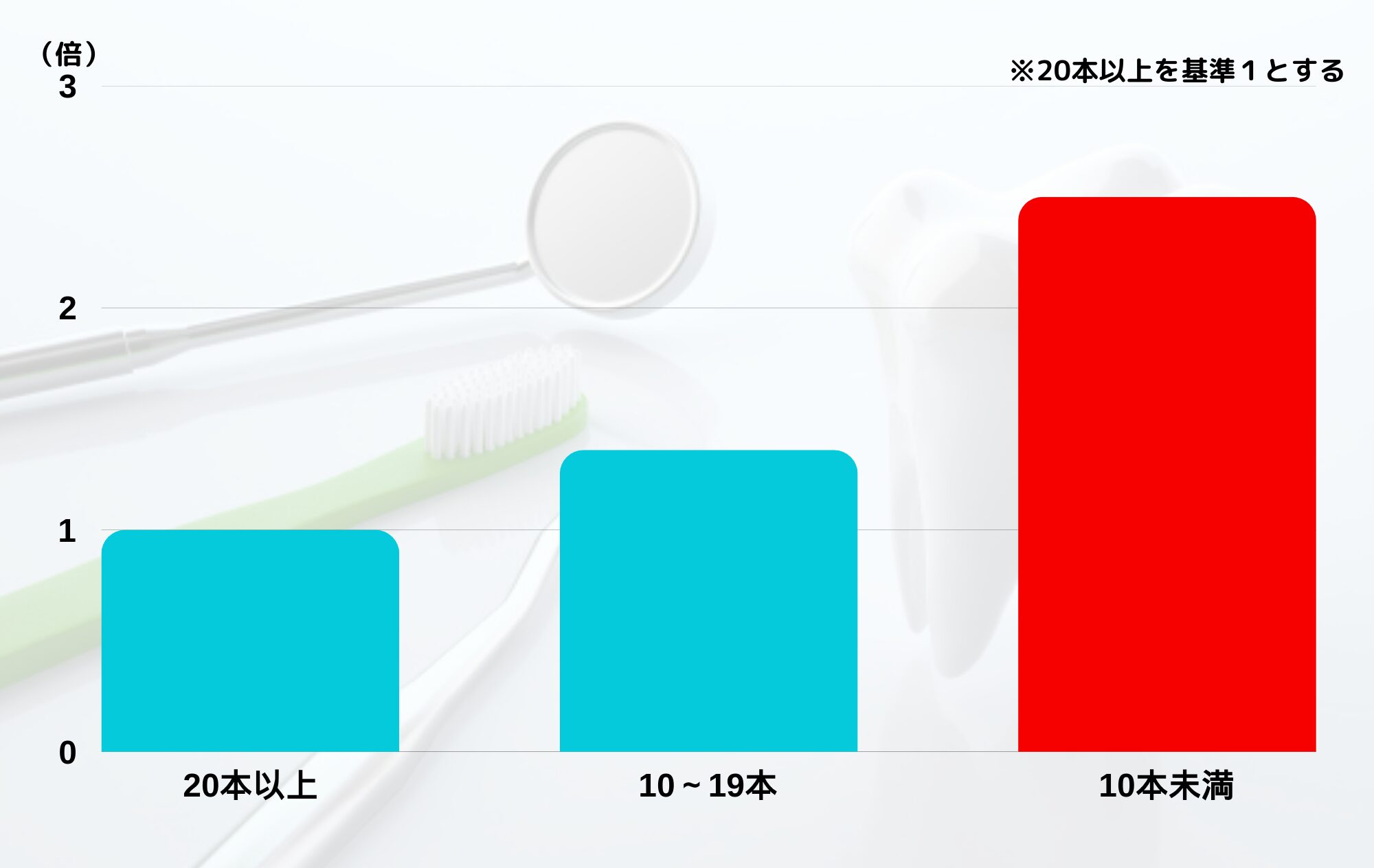 その結果、義歯も含めた噛み合わせが20本以上ある人と比較して、10~19本の人は転倒頻度が約1.36倍となり、10本未満の人は約2.5倍も高くなることが明らかになりました(図2)。