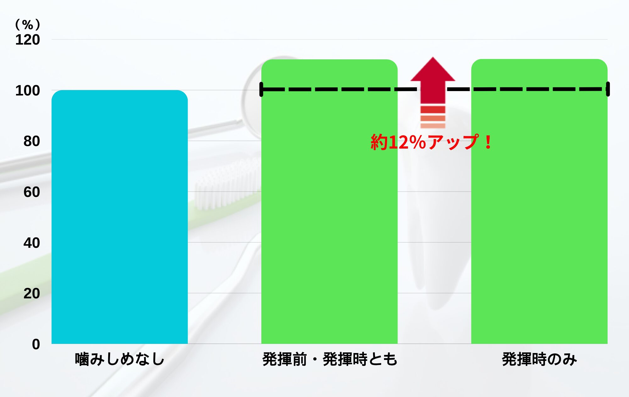 その結果、握力発揮前・握力発揮時ともに噛みしめない群と比較して、両方とも噛みしめた群は握力が約112.1%、握力発揮時のみ噛みしめた群は握力が約112.3%となり、いずれも統計学的に有意差をもって握力が強くなることが明らかになりました(図1)。