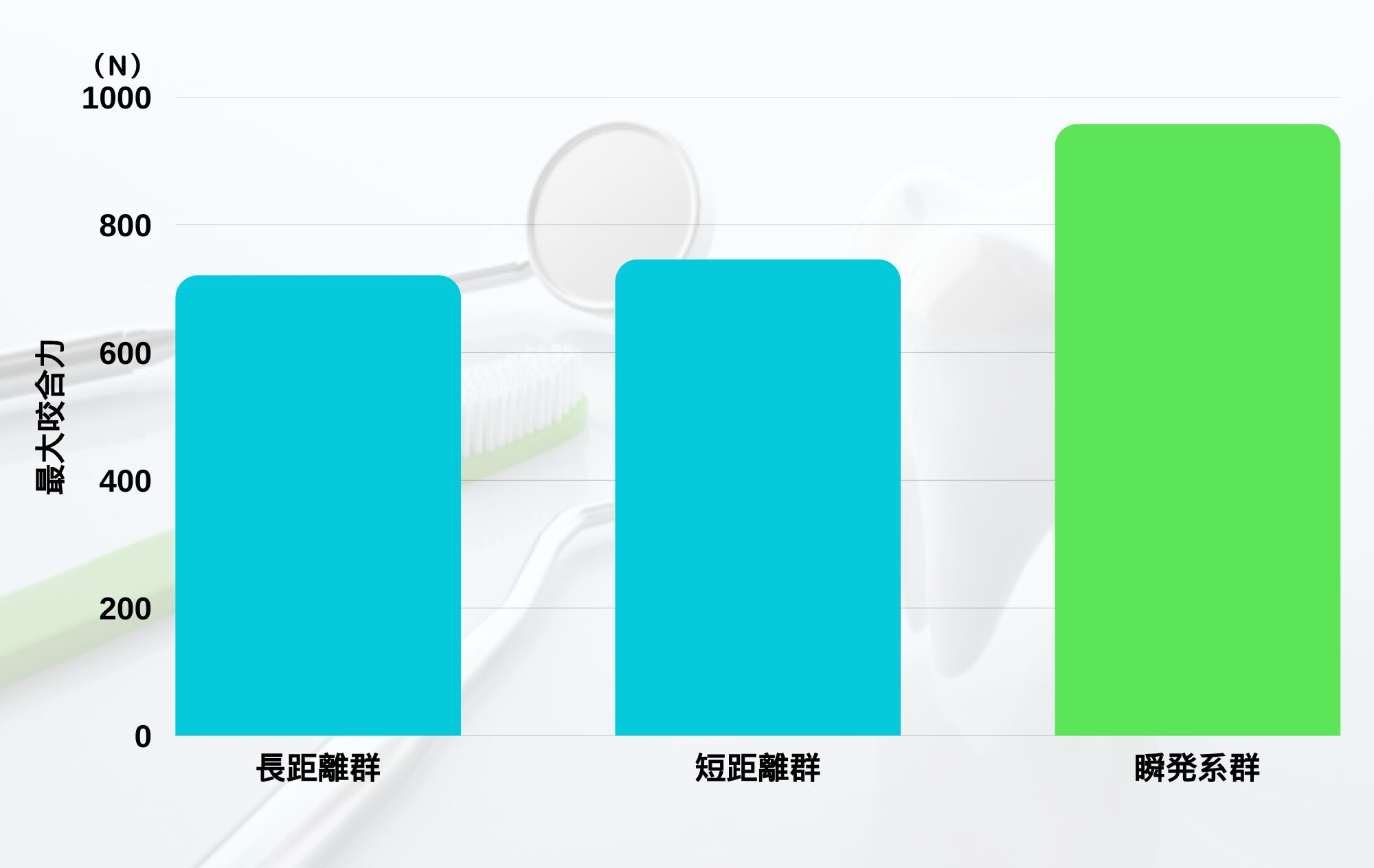 本研究の結果から、グッと強く噛みしめた時に発揮される最大咬合力は陸上競技における瞬発系種目と密接な関係にあることが示唆されました。