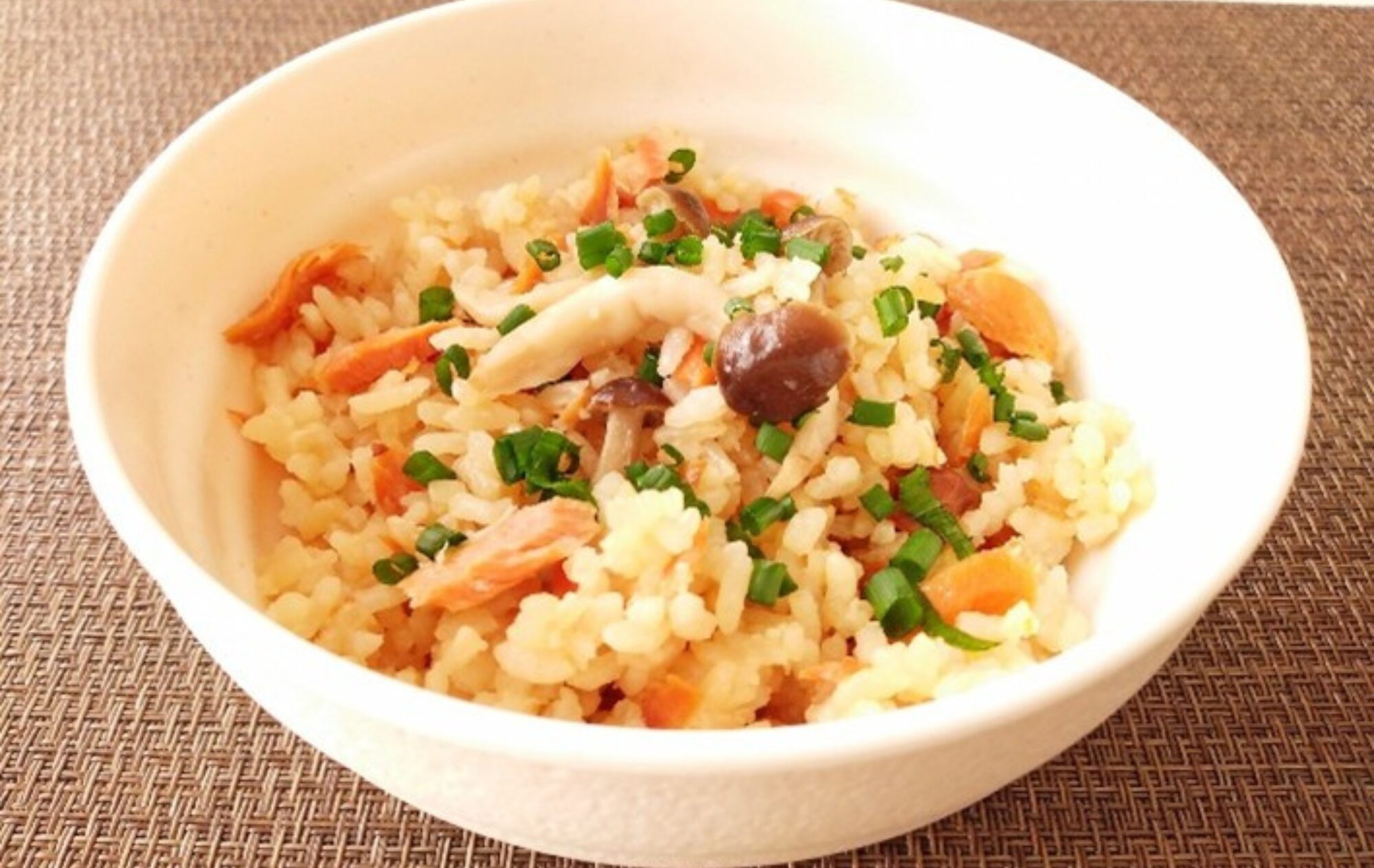⑥炊き上がったら鮭の皮を取り、全体を混ぜ合わせて完成。器に盛り、好みで万能ねぎをちらす。