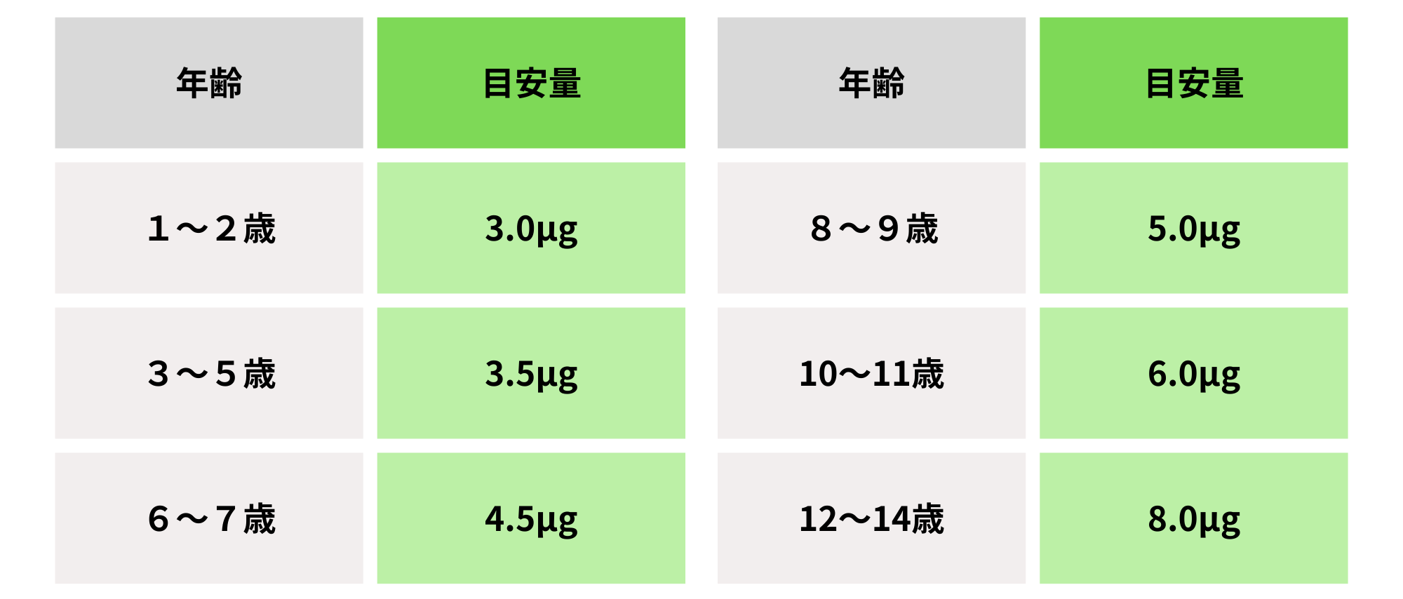 1μg(マイクログラム)はごくわずかな量ですが、体にとっては重要な役割を担う栄養素です。