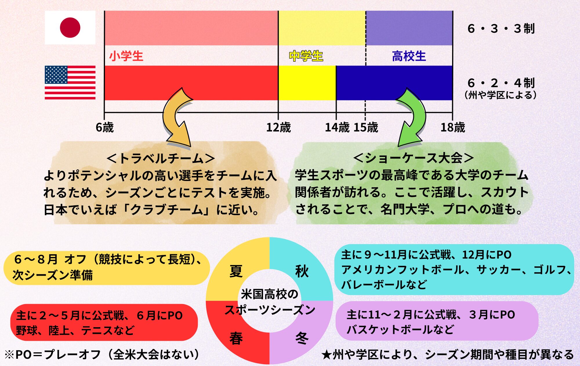 学校の運動部はシーズン制。学校は9月はじまりなので、秋・冬・春にわかれていて、それぞれの運動部の「正式」な運動部活動は3~4カ月程度である。そして、学校運動部の頂点には大学の運動部があり、その先が国の代表やプロ選手ということになる。