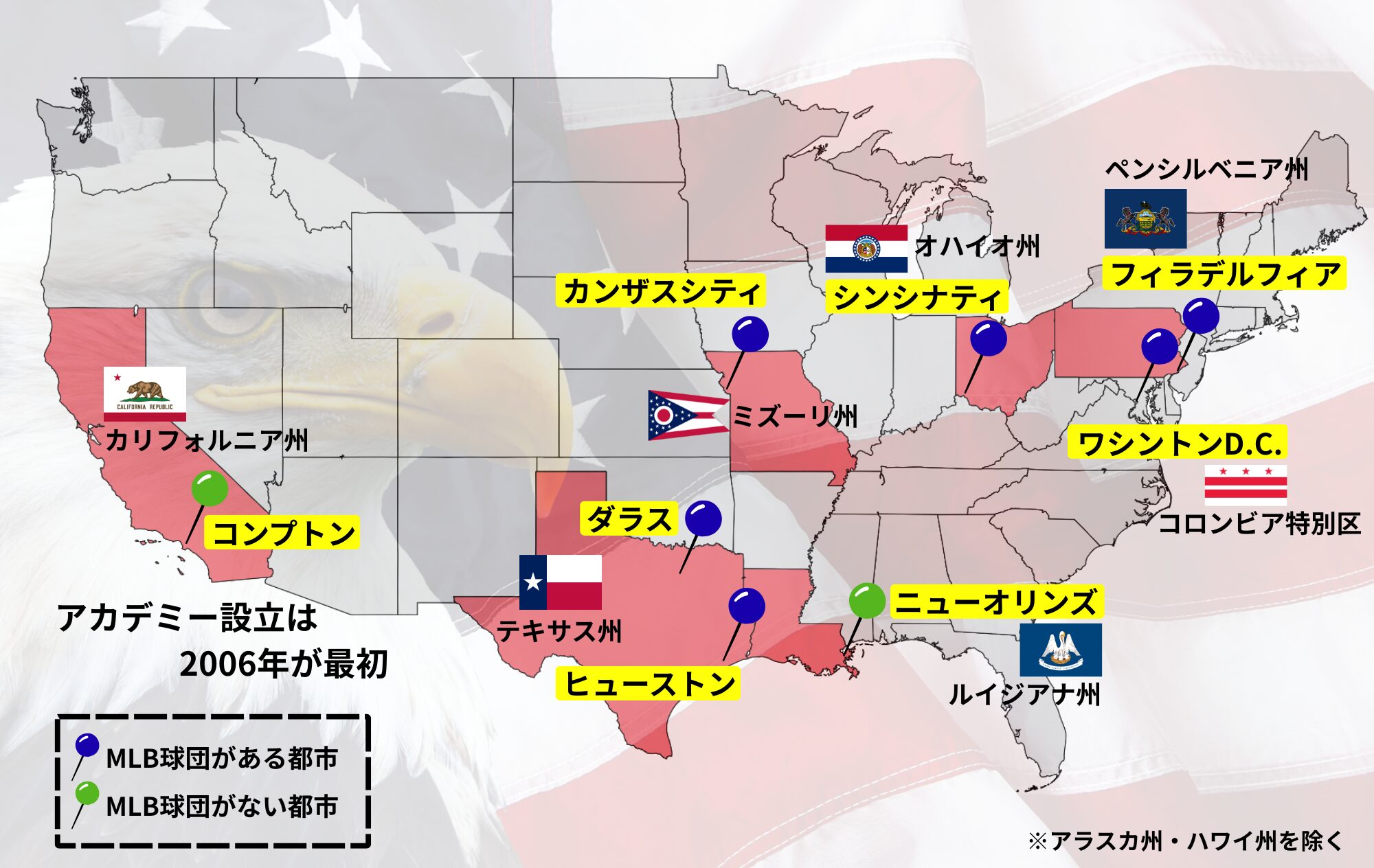 まず、MLBのユースアカデミー(ナショナルズだけはユースベースボールアカデミーが正式名称)についてお伝えしたい。このようなアカデミーを持つ都市は、ナショナルズの本拠地であるワシントンDCも含めて8都市にある。