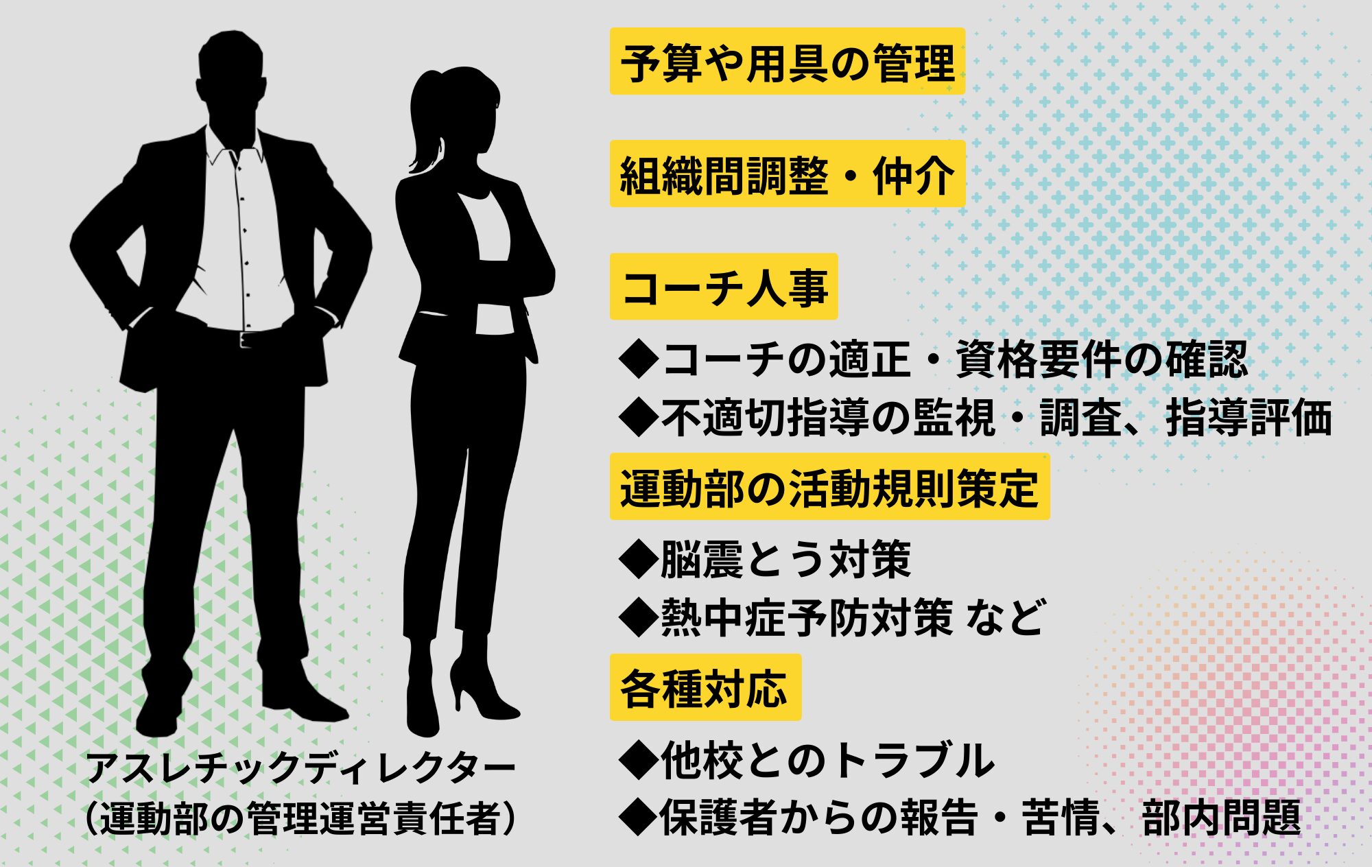 アメリカの学校の運動部には存在し、日本の学校の運動部には一般的に存在しない仕事がある。アスレチックディレクター(Athletic Director)である。学校の運動部全体の管理運営責任者で、いわば「運動部門の管理職」だ。