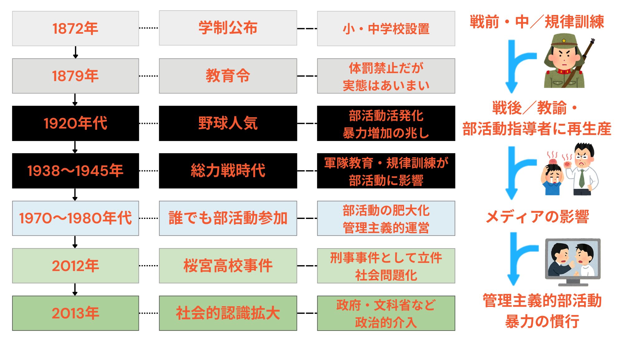 こうした教育を受けた子どもたちが大人になり、暴力のマインドを持った指導者が再生産されていくという、いわゆる「軍隊起源説(戦時中の軍隊教育がそのまま学校に影響)」が体罰の一つの流れとしてありました。