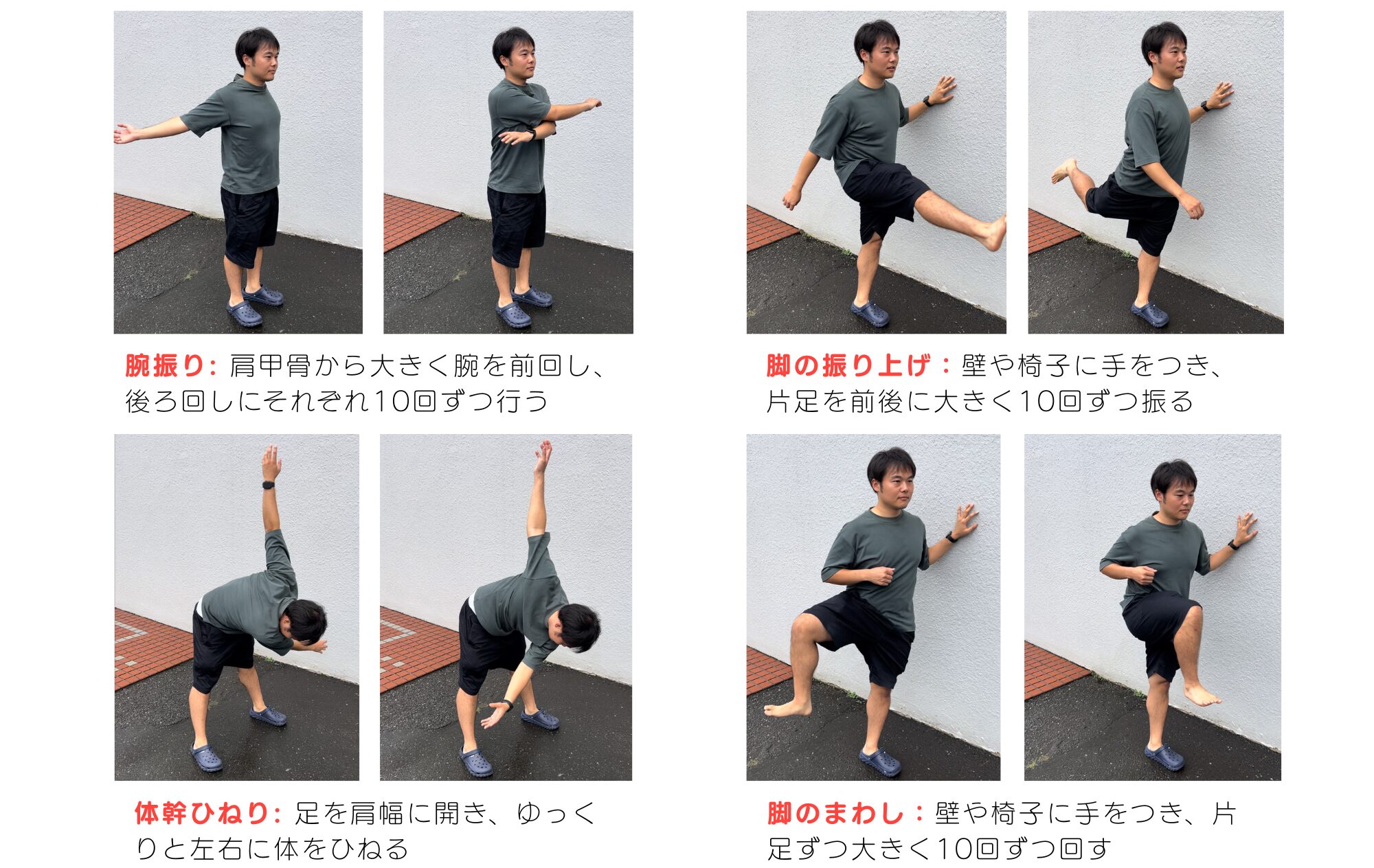 軽い有酸素運動(ジョギング、サイクリングなど)を行い、心拍数、呼吸数、血流量、深部体温を徐々に上昇させます。