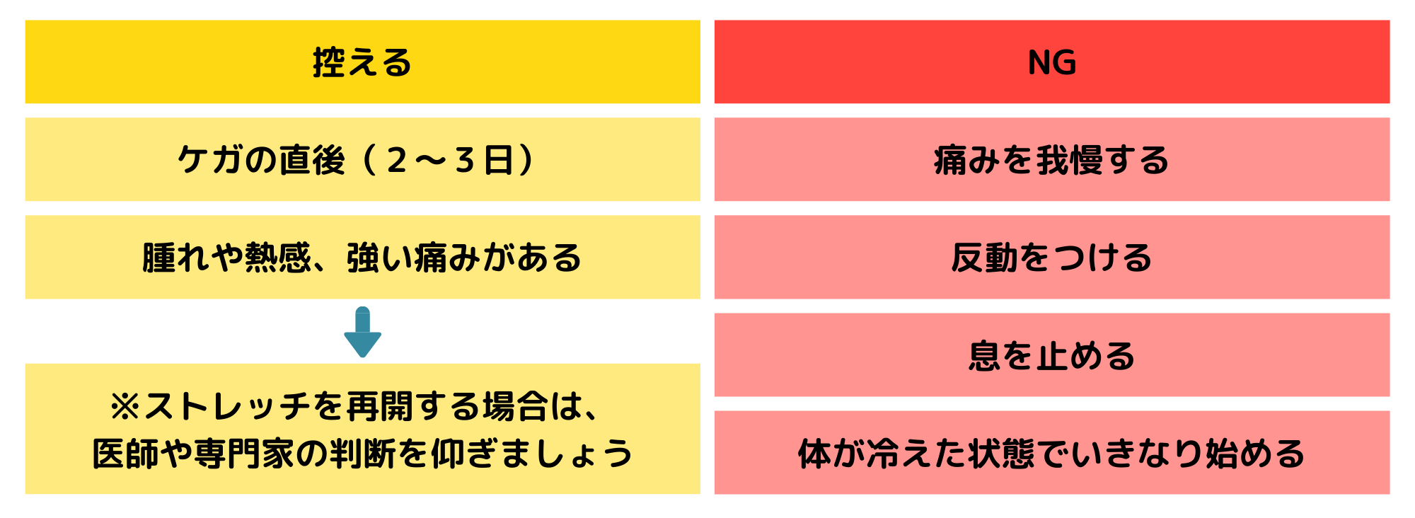 目安となるのは、「気持ちよく伸びていると感じる強度」、「痛みが出る直前で止めること」です。「痛いほど効く」という考え方は誤りで、むしろ逆効果になることもあります。