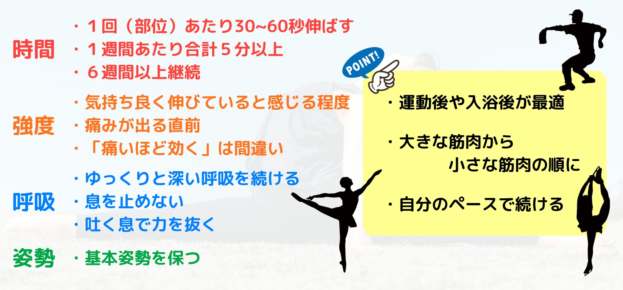静的ストレッチを効果的に行うために、いくつか押さえておきたい基本原則があります。