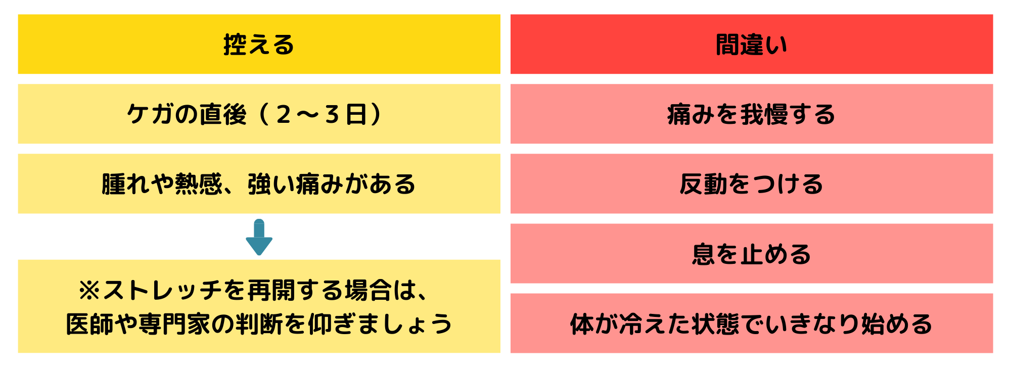 次に「強度」です。ストレッチは強く行えば良いわけではありません。目安となるのは、「気持ちよく伸びていると感じる強度」、「痛みが出る直前で止めること」です。「痛いほど効く」という考え方は誤りで、むしろ逆効果になることもあります。