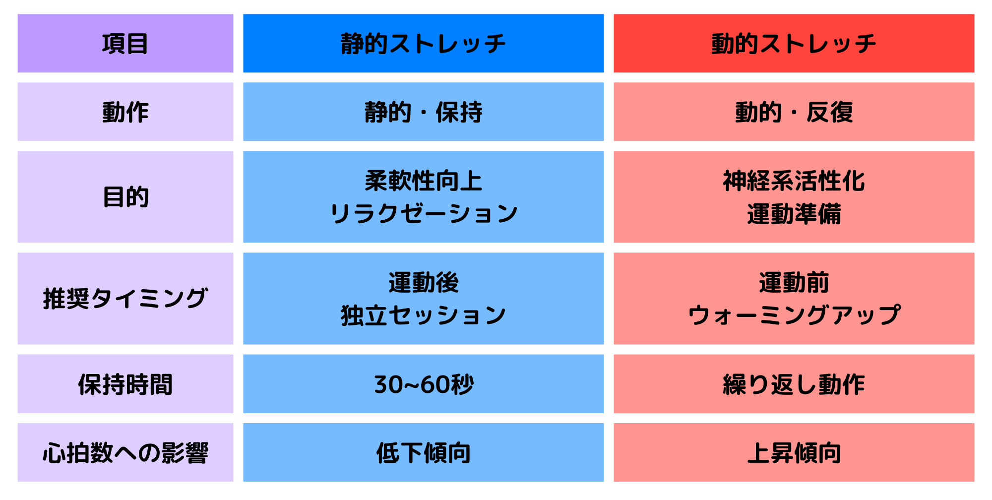 前回までに取り上げた動的ストレッチと静的ストレッチの主な違いは表1の通りです。この使い分けが、今回のテーマの核心になります。